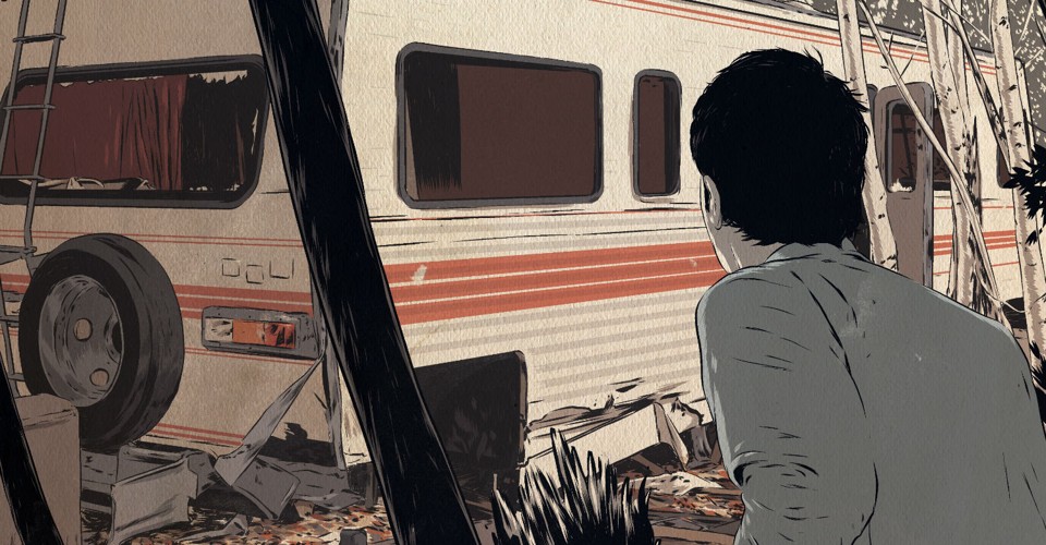 I called out Ida’s name again and again. Once or twice, I thought I heard someone calling back to me. I was nowhere near the falls yet—I didn’t hear any water—but I saw what looked like a decrepit Winnebago through the trees. I left the trail and pushed through the briars to get there. I was bleeding. A purple backpack hung on a nearby broken branch. The trailer’s windows were yellowed with pollen, and cracked. The hood was missing, and so was the engine. Weeds and vines had grown in the cracks of the metal exterior. The door creaked open when I pushed. I stepped inside. The ceiling was stained. The floors were littered with old newspapers and bits of broken glass. And in the corner of the kitchenette, silent, she was there, hands tied behind her back with rope and duct tape across her mouth. She had small leaves in her hair. She squirmed across the floor toward me.