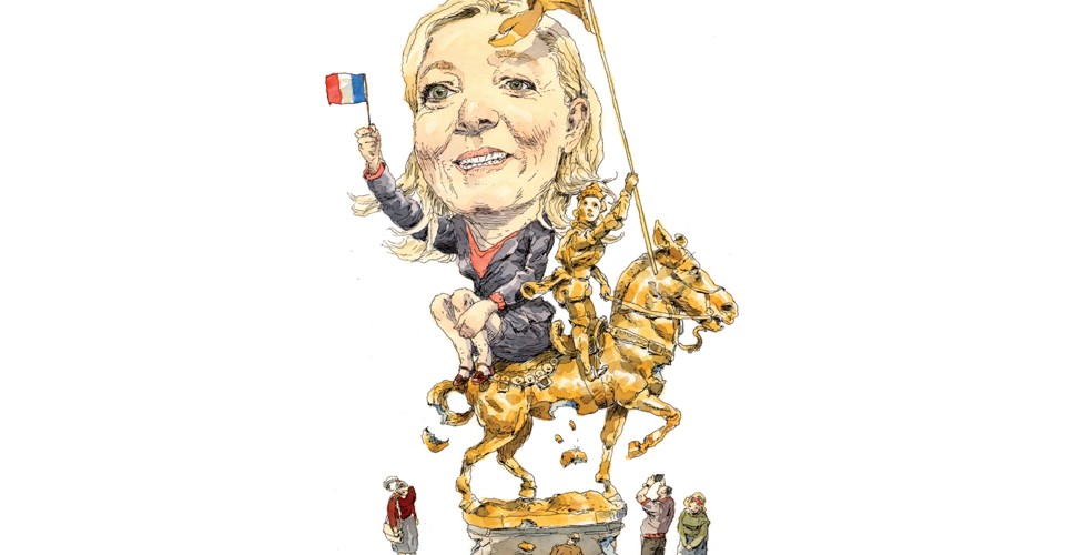 As I cross the National Front’s courtyard on my way out, I pass a bronze statue of the party’s patron saint, Jeanne d’Arc, the virgin martyr who died fending off invading British soldiers during the Hundred Years War. Marine named her first daughter Jehanne, in homage, and each May 1—Labor Day, in France—she lays a wreath of flowers at the feet of the fully armored Maid of Orléans statue at the Place des Pyramides, in the First Arrondissement. None-too-subtly identifying herself with the medieval warrior, Marine told a crowd last year that just as she had been criticized for wearing jeans, “Jeanne d’Arc was frowned upon for her masculine attire.”