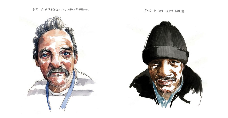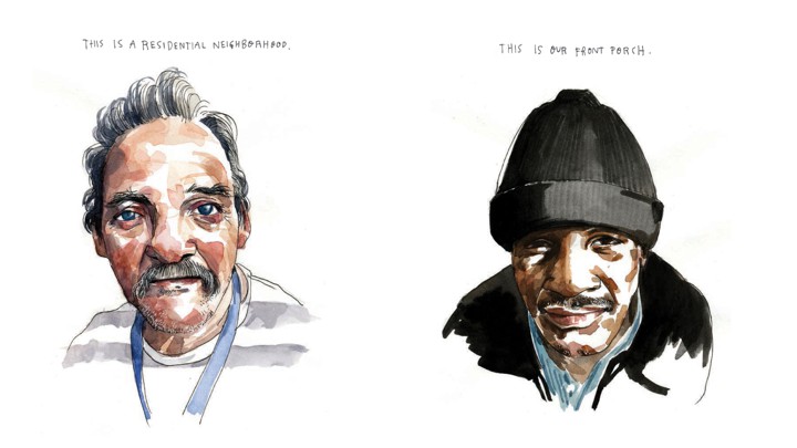 For a chapter on Fifth and Sixth Streets, near the Mission District—where latte-sipping techies are separated from the occupants of shelters and low-budget hotels by only a single block—MacNaughton spent almost a month standing on street corners and leaning against buildings, using up four or five Micron pens each day. She dressed neutrally in the hopes of slipping undetected between the communities. But a sketchbook is more approachable than a reporter’s notepad or camera, she says, and “people constantly come up to me and ask me what I’m drawing.” That interaction is now central to her process: whereas she once captioned her sketches of train passengers with what she imagined they were thinking (“I was totally projecting,” she says, “You know, I'm so unhappy in my job”), listening exposes more than she can see.