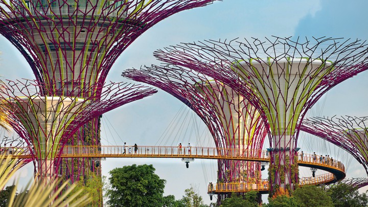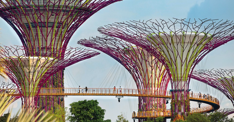 The “Supertrees,” designed by the British landscape-architecture firm Grant Associates on the site of a former parking lot, are the focal point of the first and largest of the Gardens by the Bay. They loom over 133 acres of blooms and foliage: 18 steel-and-concrete trunks between 80 and 160 feet high, draped in climbing vines and flowers and crowned with zigzagging wire branches. Lit up at night, the Supertrees look like futuristic cocktail glasses.