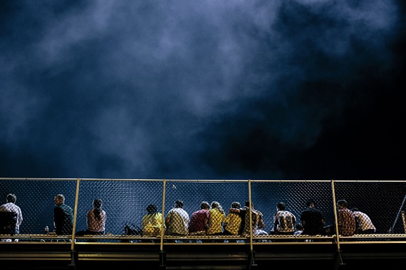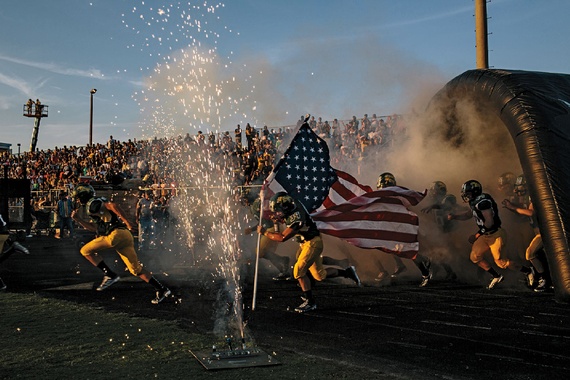 Instead, the entire community seemed to be outside on the vast fields near the high school and middle school, seduced by the Thursday-night pause before the first home football game of the season, which would take place the next night. The sun was dropping and taking the worst of the August heat. Little kids were kicking up dirt on the baseball field or practicing their cheerleading (“Time to get loud! Time to represent!”). Parents were leaning against their bumpers drinking water or soda, and teenagers were using their bodies in ways the parents could admire: slamming into tackling dummies at the final pregame practice, doing sumo squats, running around the track.