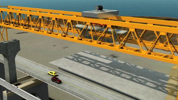 Two custom-made gantry cranes , each 500 feet long and 40 feet across, are now lifting precast sections of ramp into place atop the columns.