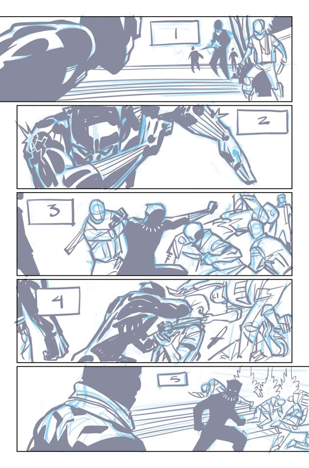 Ideally, the writer offers notes in his script on how the comic book should look. This requires thinking with intention about what a character is actually doing, not merely what he is saying. This is harder than it sounds, and often I found myself vaguely gesturing at what should happen in a panel—“T’Challa looks concerned.” Or “Ramonda stands to object.” I was lucky in that I was paired with a wonderful and experienced artist, Brian Stelfreeze. Storytelling in a comic book is a partnership between the writer and the artist, as surely as a film is a partnership between the screenwriter and the director. Brian, whose art is displayed here, doesn’t just execute the art direction—he edits and remixes it. I decide the overall arc of the story, and the words used to convey that arc—but Brian ultimately decides how the story should look. The script for the second page of Black Panther #1 called for a big, splashy panel depicting a massacre. Brian drew that panel, but he also drew two other, overlapping panels that depicted T’Challa’s realization of the tragedy unfolding around him. Our partnership doesn’t end with the art, either. Brian’s concept drawings for Black Panther ultimately influenced the plot.