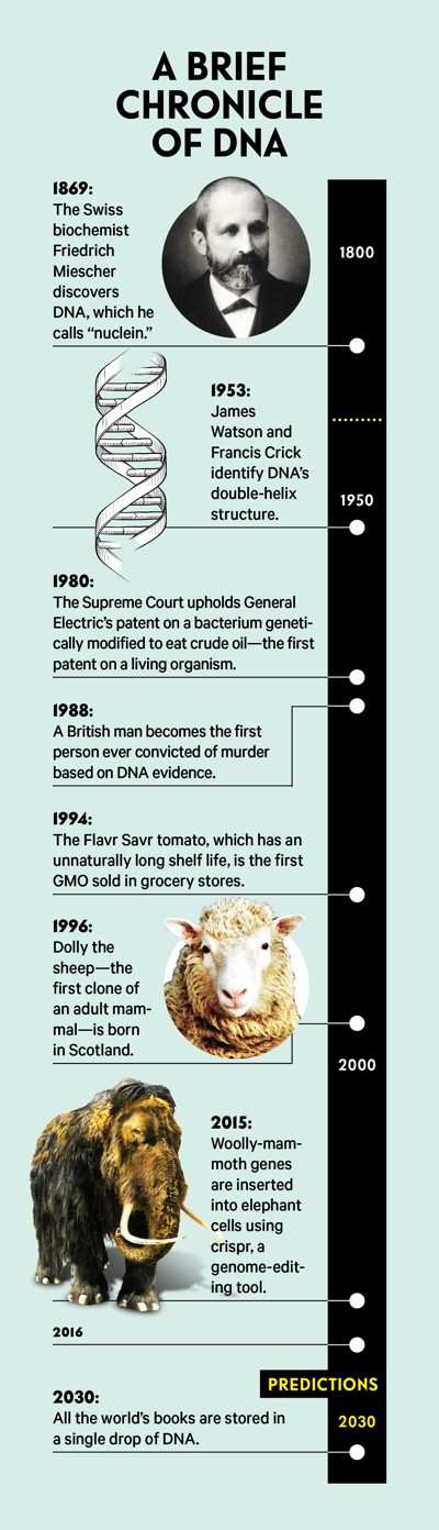 In the past couple of decades, genetics has revolutionized fields such as agriculture, criminal justice, and—of course—medicine. In the next couple, expect DNA to turn up in such far-flung disciplines as archaeology, fine arts, and computing. The DNA molecule is capable of storing vast amounts of data and is remarkably resistant to deterioration—it can survive for thousands of years—and we’ve only just begun to explore its many possible applications. Here are some of the ways it might be put to use in the future.
