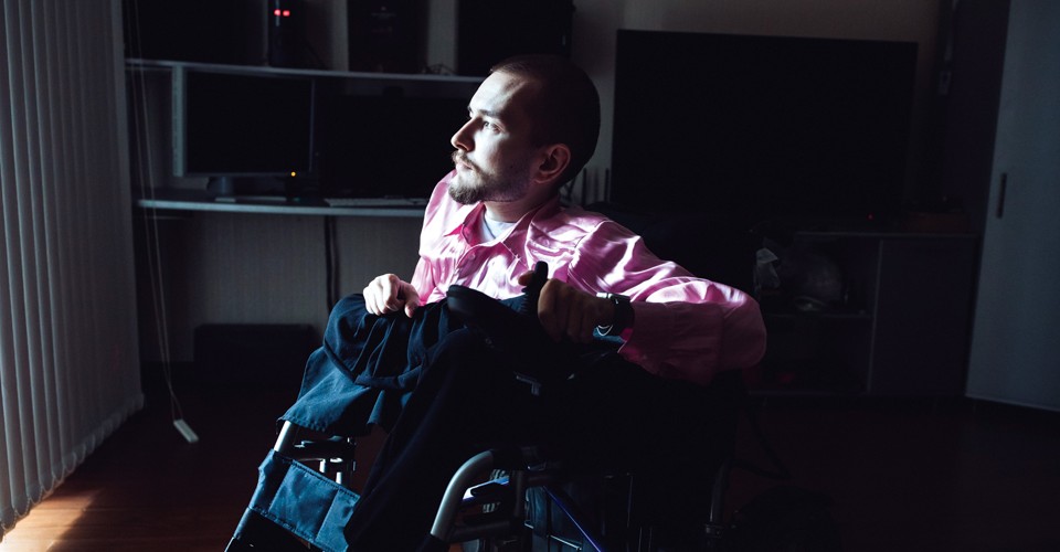 White’s trip to Ukraine did accomplish one thing, however: It captivated a crippled boy named Valery Spiridonov—the Russian on the poster in Ren’s lab. Spiridonov, now 31, has Werdnig-Hoffmann disease, a genetic disorder that wastes away muscles and kills motor neurons—nerve cells in the brain and spinal cord that help move the body. He has no memory of ever walking, and his movement today is limited to feeding himself, typing, steering his wheelchair with a joystick, and little else. He sits with his right leg perpetually crossed over his left, and his body below the neck looks shrunken, almost deflated. His condition is fatal, but there’s no telling how much time he has left—according to doctors, he should have died long ago.