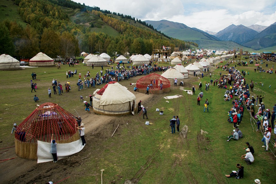 Many of the events were played on the shores of Issyk Kul, one of the world’s largest alpine lakes, while others took place in a mountain meadow. Events ranged from an 80-kilometer horse race to hunting with golden eagles to horseback archery to high-speed yurt building. One of the most dramatic sports was er enish, in which two men try to wrestle each other off their horses. In another mounted sport, called cirit, players throw blunt lances at their opponents—think Genghis Khan meets red rover, with javelins.