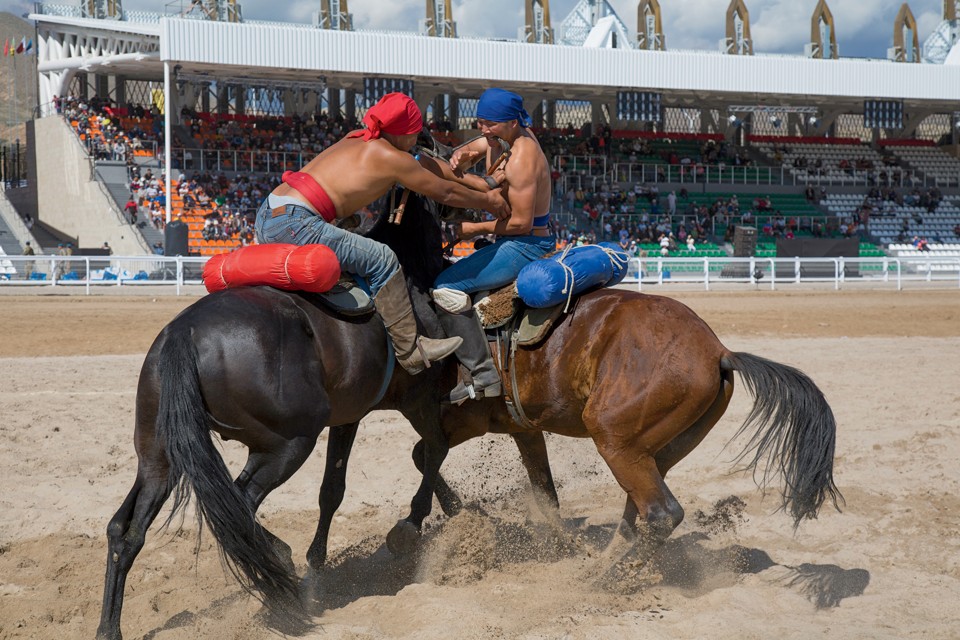 The Americans kicked their mounts and charged off the stadium’s sidelines, sprinting toward a recently beheaded goat carcass. But their opponents, a Russian team composed mostly of ethnic Kyrgyz living in Russia, were faster. This was far from their first game of kok-boru, the signature event of Kyrgyzstan’s World Nomad Games. At a full gallop, one Kyrgyz horseman leaned out of his saddle and, riding nearly upside down, deftly snatched up the 70 pounds of dead goat. Then he did something unheard-of in the history of a sport that is said to go back to the time of Genghis Khan: He passed the carcass to one of the Americans.