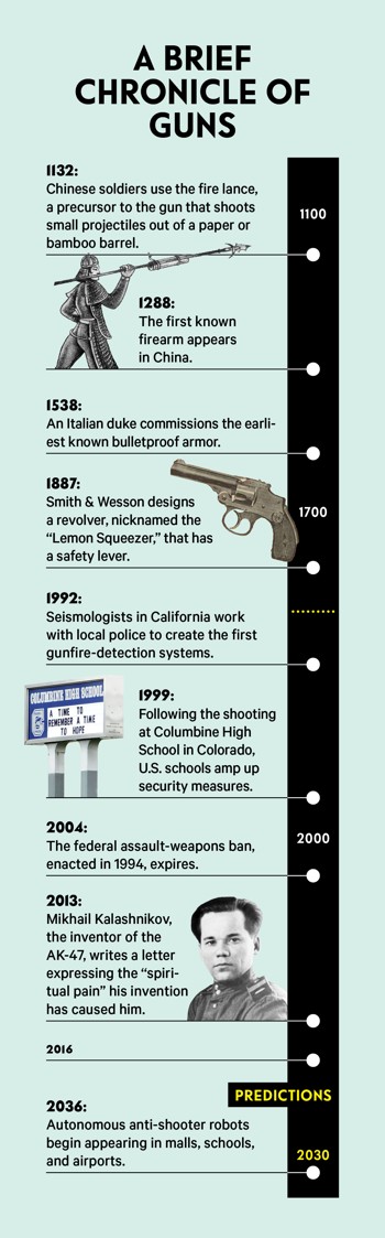 Guns could be equipped, for instance, with the same radio transmitters found in cellphones, giving them unique ID numbers and providing time-stamped data on the number of rounds they’ve fired. The safety could then be controlled via an app, which would send commands to ultra-lightweight levers in the stock of the gun. If police were given a backdoor into the software, Tang says, they might be able to check cell-tower records to determine which guns have been fired in the vicinity of a shooting and then disable them.