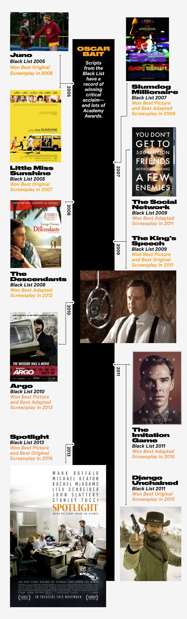 The movies that have come out of Black List scripts comprise a Murderers’ Row of critics’ picks: Spotlight, The Revenant, Whiplash, Argo, The King’s Speech, Slumdog Millionaire, The Wrestler, Juno, There Will Be Blood. Four of the past eight Best Picture winners at the Oscars and nine of the past 18 winners for Best Screenplay or Best Adapted Screenplay appeared on the Black List.