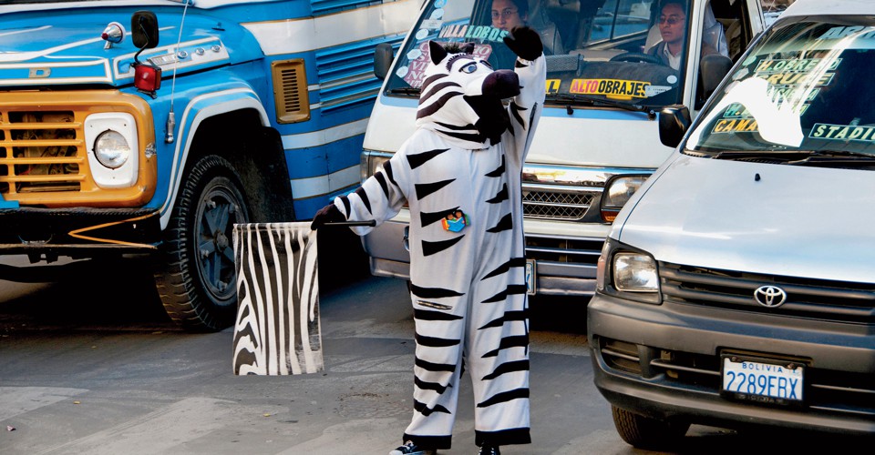 After a meeting with Mockus, Pablo Groux, who worked for La Paz’s government, was inspired to make his city’s “zebra crossings” (striped crosswalks) come alive. La Paz’s cebritas employ similar tactics to Bogotá’s mimes—they dance, gesture comically at drivers, and help pedestrians safely cross the street. When the program launched in 2001, it included just 24 zebras; today, La Paz has 265, and the cities of El Alto, Tarija, and Sucre have dozens more.