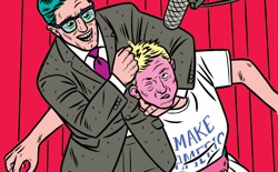 Baldwin walked out onto the stage and, as if by dark magic, there he was: not Trump, exactly, but some nightmarish goof on Trump, a distillation of everything gross about him, boiled clean of any remnant that could be mistaken for competence or redemption. Unlike Fey’s pitch-perfect echo of Palin, Baldwin’s Trump isn’t an impersonation. He saves his more accurate work for Tony Bennett, for Robert De Niro, for Al Pacino—for men he loves and admires. Those are mischiefs, born of appreciation. His Trump is mimicry, born of disgust. Even after so many successful appearances—even after his and Trump’s visages have become so closely associated that a newspaper in the Dominican Republic ran a photograph of his Trump instead of the real one—Baldwin can still seem as though he doesn’t have the stomach to inhabit Trump fully. “Push, push, push,” he says in his makeup chair, his lips once again threatening to burst from his distorted face. “It’s exhausting. I’m hoping I can come up with someone else I can imitate. Pence?” In the meantime, he will keep his Trump at a remove, almost like an abstract painting, not of Trump the man but of Trump’s withered soul.
