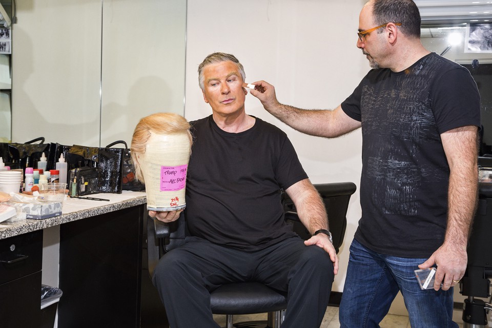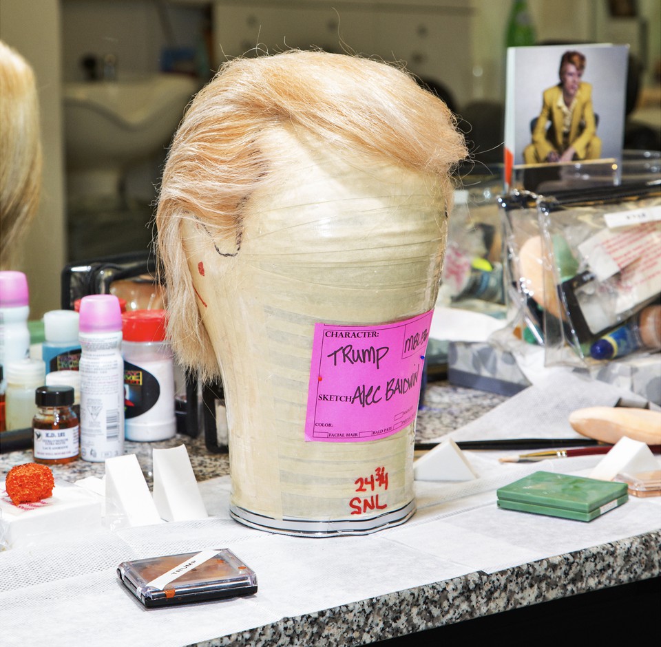 On a shelf behind him, his custom-made Trump wig shines golden on a life-size model of Baldwin’s head. The shelf contains the disembodied heads of every cast member, each labeled with a name and a size. Vanessa Bayer has the smallest; Baldwin’s dome is tied with several others’ for the biggest. There have been rumors that he will wear the wig for the entire show—that on Saturday, February 11, he will play Trump in every sketch. The team here in makeup has heard as much.