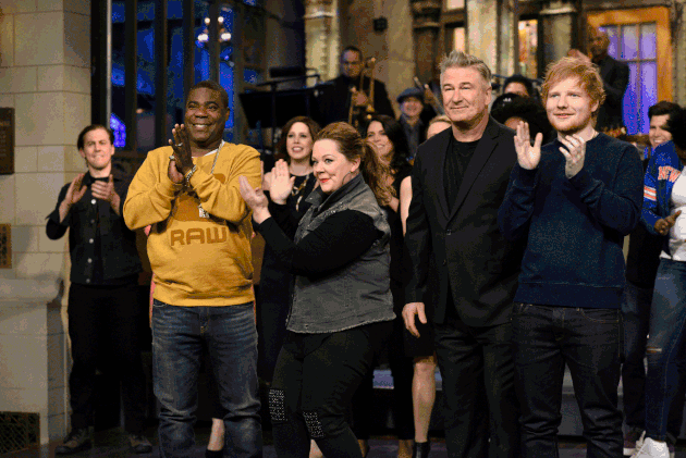 On Thursday, endless rounds of rehearsals begin, and special attention is about to be paid to the gassy-gym-student sketch. Baldwin has already had a busy day. He’s just finished shooting the show’s promos with Ed Sheeran, the week’s musical guest, his tangled mop of ginger hair the antithesis of Baldwin’s now-immaculate head. He’s somehow gaining energy as the week goes on, his body looking fit and alive in his perfectly tailored suit. In one of the clips, Sheeran is meant to do his own Trump impersonation, and he seems uncertain that it’s a good idea. “Are you sure this is funny for an Englishman to do?”