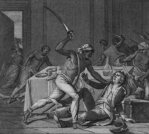 These scenes draw heavily on imagination, as few historic images flesh out this world. Ware hopes to haul the era up from what he describes as a “visual abyss” with a forthcoming series of graphic novels, the first of which is titled Other Side of Wall Street. The novels layer Ware’s own photographs of costumed actors 4 with illustrations by William Ellis and snippets of historical letters and maps. Given the dearth of archival material from New York, Ware and Ellis found inspiration in images from other parts of North America (like an engraving of a Jamaican slave uprising 5). Part of the first volume, charting an ocean voyage, came out in June; Ware plans to stretch the multi-century story across five installments.