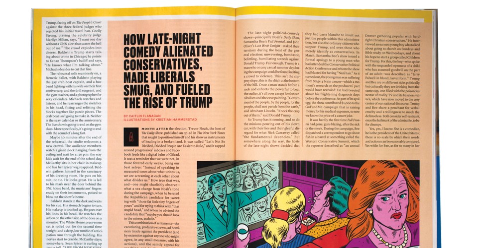 Caitlin Flanagan’s May article, “How Late-Night Comedy Alienated Conservatives, Made Liberals Smug, and Fueled the Rise of Trump,” provoked responses from, among others, Michael Gerson, a former speechwriter for George W. Bush, and Trevor Noah, the host of The Daily Show.
