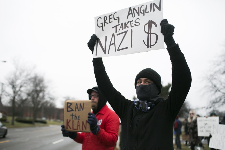 Columbus, Ohio, is a funky, still kind-of gritty city, and I went there in January looking for clues to Anglin’s past. On a rainy Saturday, about 45 protesters, some with black masks covering their faces, gathered outside a drab two-story building in Worthington, a suburb of Columbus, where Anglin’s father, Greg, runs a Christian counseling service.