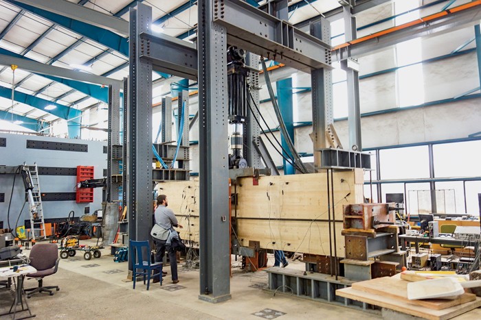 Robinson’s team put both components through rigorous fire testing. A joined beam, column, and CLT panel were placed in a furnace, then weighed down with 25,000 pounds, to see how strong they would be after exposure to fire and heat. Two hours later, they emerged charred, but structurally intact. Mass timber doesn’t ignite easily—it’s more like a log than kindling. And the outer char layer that mass timber develops when burned actually insulates the wood.