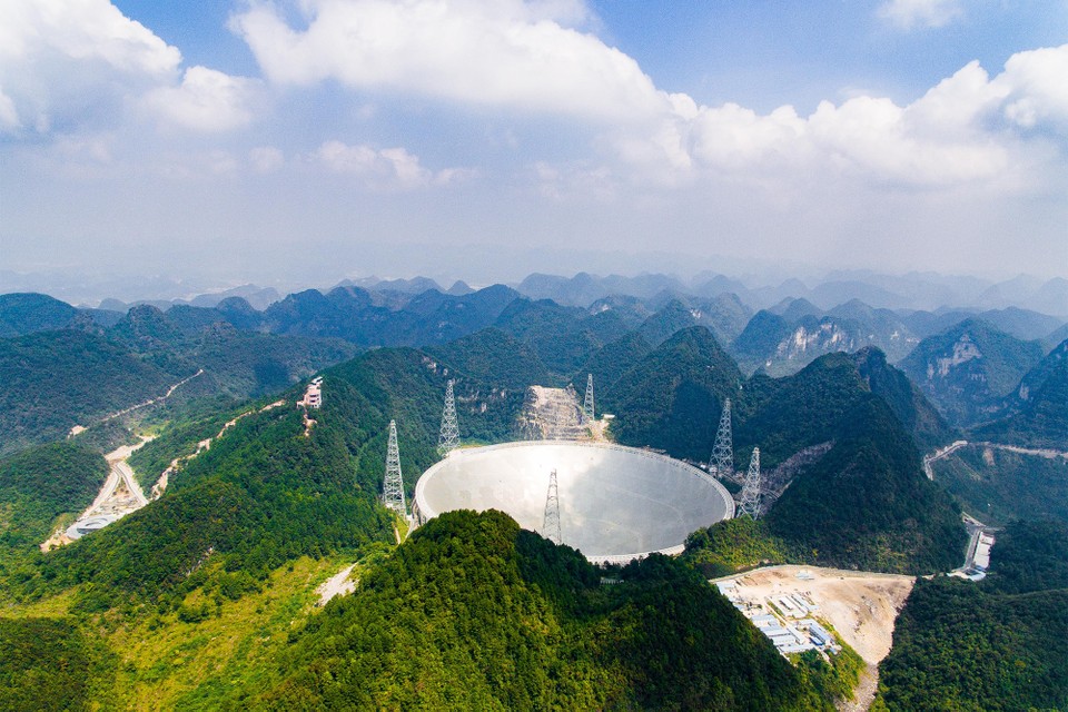 Apart from microwaves, such as those that make up the faint afterglow of the Big Bang, radio waves are the weakest form of electromagnetic radiation. The collective energy of all the radio waves caught by Earth’s observatories in a year is less than the kinetic energy released when a single snowflake comes softly to rest on bare soil. Collecting these ethereal signals requires technological silence. That’s why China plans to one day put a radio observatory on the dark side of the moon, a place more technologically silent than anywhere on Earth. It’s why, over the course of the past century, radio observatories have sprouted, like cool white mushrooms, in the blank spots between this planet’s glittering cities. And it’s why Nan went looking for a dish site in the remote Karst mountains. Tall, jagged, and covered in subtropical vegetation, these limestone mountains rise up abruptly from the planet’s crust, forming barriers that can protect an observatory’s sensitive ear from wind and radio noise.