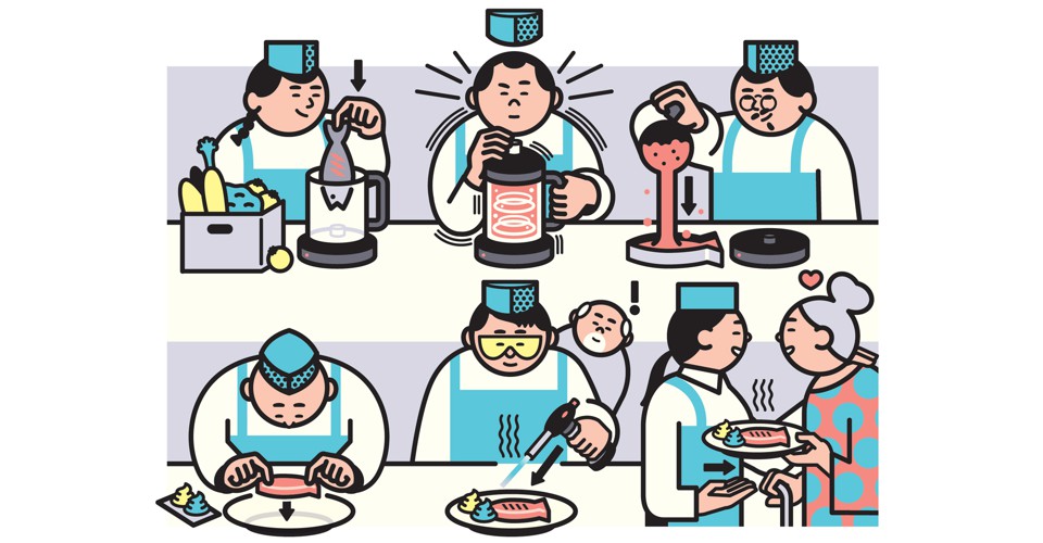 Instead of settling for, say, a cup of Ensure-brand pudding, throw some cooked salmon in a blender. Then, with a little help from modern chemistry, mold the resulting pink puree back into the shape of a fillet, and add “grill” marks with a propane torch. Presto: salmon that looks like it was plated in a restaurant and almost tastes that way, minus the flaky texture.