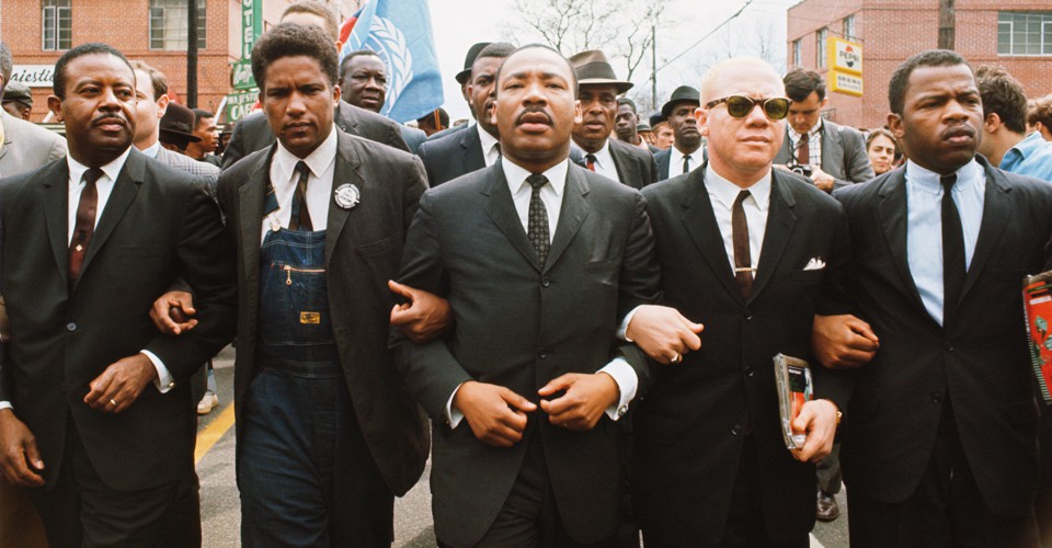 Image above (from left): Ralph Abernathy, James Forman, Martin Luther King Jr., Jesse Douglas, and John Lewis. King leads the five-day, 54-mile march for voting rights in 1965, from Selma, Alabama, to Montgomery. Lewis was 25 years old at the time.
