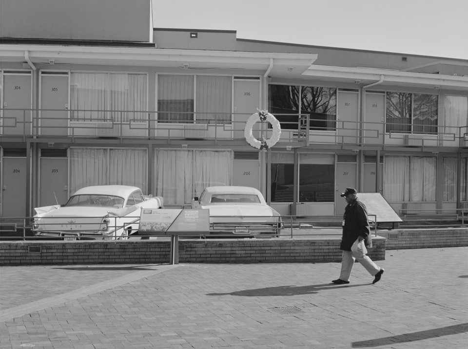 The Lorraine Motel, where King was assassinated, has since been reenvisioned as the National Civil Rights Museum, which preserves many of the exact details from the day of the murder. A Dodge and a Cadillac are parked in the lot below room 306 (above); a white wreath on the railing honors the room’s most famous occupant (below). The assassin James Earl Ray shot King, who was standing on the balcony, from a flophouse bathroom across the street.