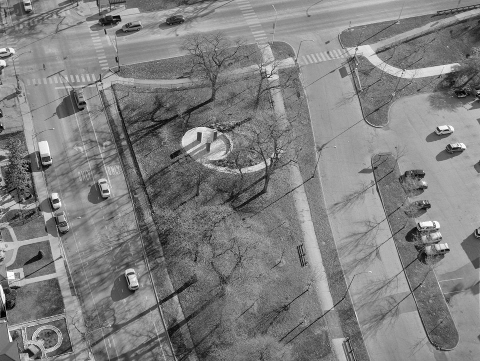During a march into the Gage Park neighborhood from Marquette Park (above), protesters were met by white counterprotesters, who pelted King with rocks. The Martin Luther King Jr. Living Memorial (below), commemorating the incident, was unveiled in Marquette Park in 2016.