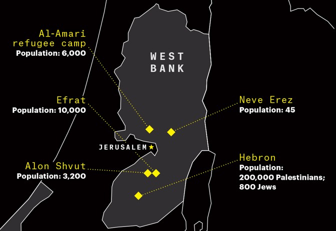 The people at Hartman—and the people in the cafés of Tel Aviv—could, theoretically, be part of a solution. But I knew this was only one side of Israel—empathetic, nuanced. For my most recent trip, I wanted to go where the deepest fault lines—and what I believe is the biggest impediment to peace—lie: the settlements in the West Bank, the home of the several hundred thousand Jews who have moved to the heart of what is, legally, Palestine.