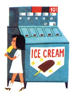 Šašek left RFE in 1957 to work on his long-postponed children’s book about Paris, discarding the folktale aesthetic he’d cultivated in the 1930s and ’40s. Now his style was panoramic, suavely avant-garde, and indebted to the flashy colors and graphic flair of advertising. For the RFE leaflets, he’d drawn drab Eastern-bloc shops with sold out signs in the windows. The This Is books, by contrast, revel in the dazzling plenty of postwar, go-go capitalism. The marvel of New York isn’t the city’s icons—the Empire State Building, the Statue of Liberty—though Šašek of course drew those. Rather, it’s the many-hued dresses being pushed uptown on a cart, the bundles of fat Sunday papers stacked up outside the newsstand, the vending machines stuffed with everything you might want: a 10-cent bowl of soup “served piping hot,” peanuts, stamps, pens, identification tags, ice-cold drinks, and “Sensational studio-like photos”—“automatic, private”—in 50 seconds.