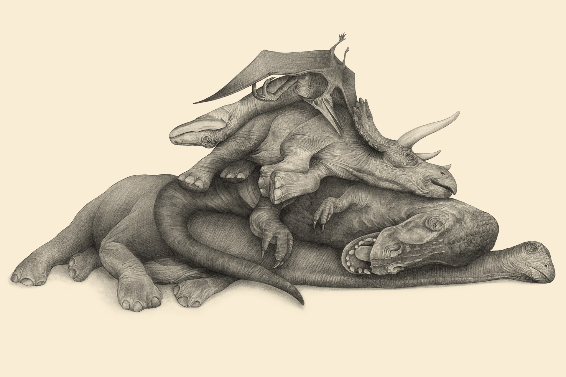 Seven hundred million years ago, the oceans’ single-cell organisms started linking together to form multicellular creatures. Four hundred and forty-four million years ago, nearly all of those animals were wiped out by the planet’s first global annihilation. The Earth recovered—fish appeared in the seas, four-legged amphibians crawled onto land—and then, 372 million years ago, another catastrophe destroyed three-quarters of all life. For more than 100 million years after that, creatures thrived. The planet hosted the first reptiles, the first shelled eggs, the first plants with seeds. Forests swarmed with giant dragonflies whose wings stretched two feet across, and crawled with millipedes nearly the length of a car. Then, 252 million years ago, the “Great Dying” began. When it finished, 96 percent of all species had vanished. The survivors went forth and multiplied—until, 201 million years ago, another mass extinction knocked out half of them.