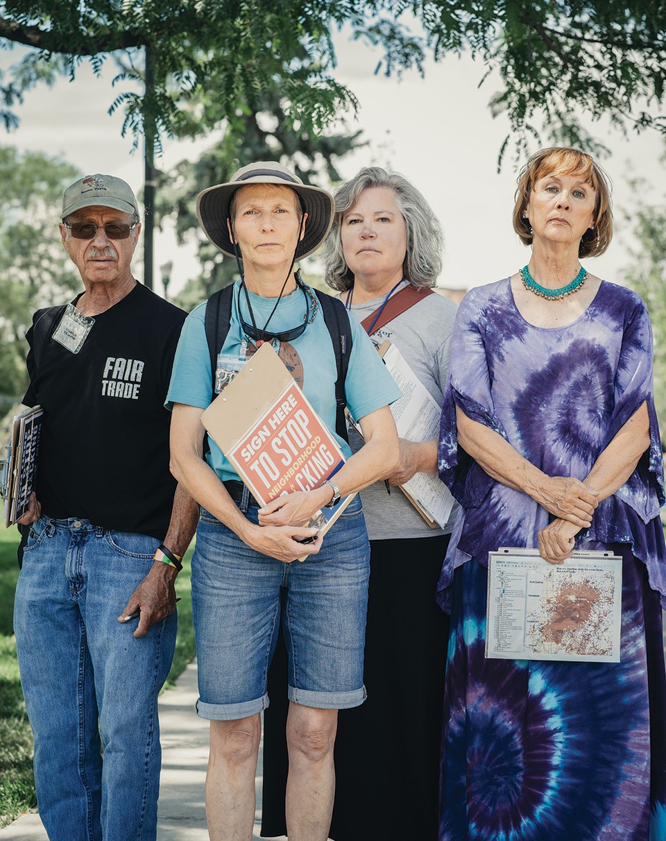 Don Perl, Jutta Seeger, Therese Gilbert, and Tannis Bator (above) volunteer for Colorado Rising, an organization fighting for more stringent fracking regulations in the state. The organization recently submitted a petition with thousands of signatures in an effort to pass a statewide ballot initiative that would establish buffer zones between oil-and-gas operations and homes, schools, playgrounds, drinking-water sources, and other sensitive places.