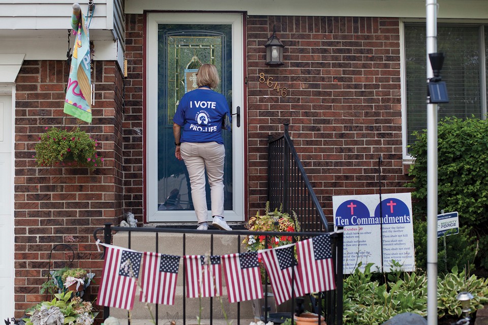 Sandy Burton knocks on a door for the Susan B. Anthony List, an anti-abortion political group. With a Supreme Court vacancy and the potential opportunity it brings to change the law, anti-abortion groups are mobilizing forces at the local level.