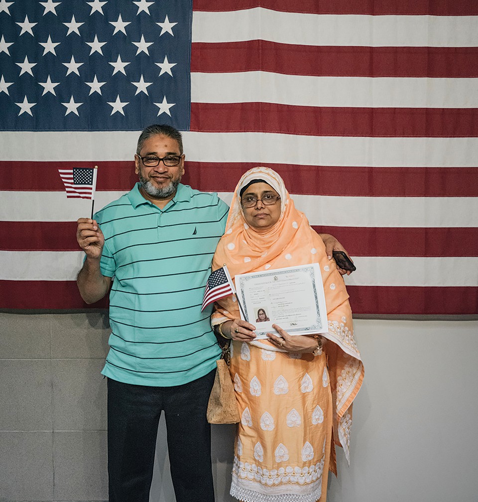 Holding her certificate, Jannat Chowdhury (above) poses with her husband, Shahadat; both are immigrants from Bangladesh.