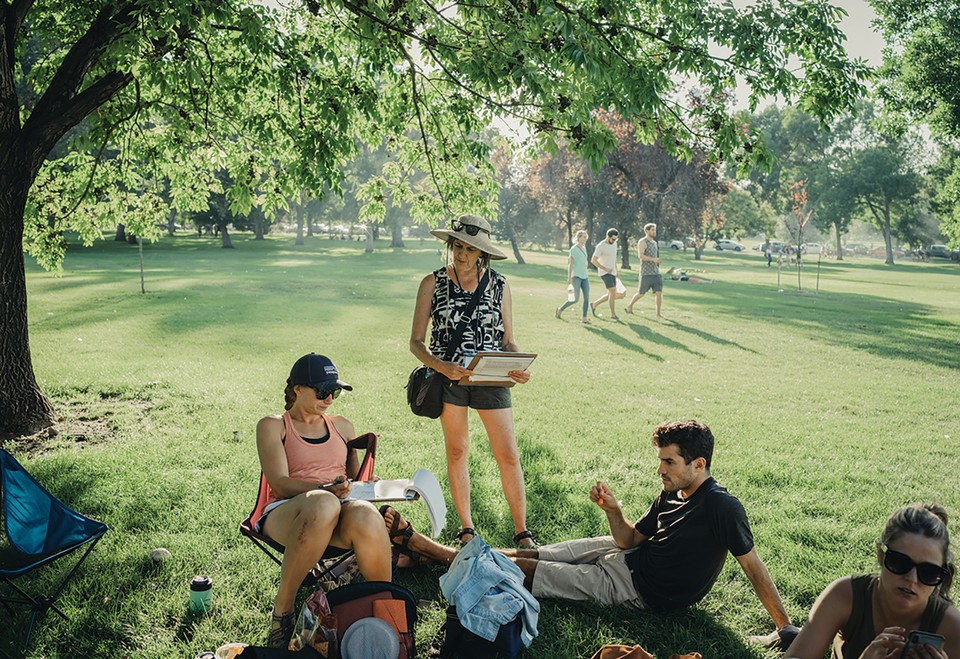 Lauren Swain (below) gets signatures for the ballot initiative in a park.