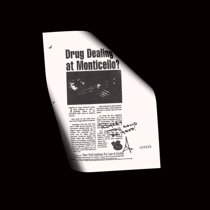 Later, using a front organization called the New York Institute for Law and Society, Trump and his associate Roger Stone placed advertisements in upstate–New York newspapers in an attempt to block the Saint Regis Mohawk Tribe’s planned Sullivan County casino. On a page proof of one ad, featuring hypodermic needles and lines of cocaine, Trump wrote: “Roger, this could be good!” Trump, Stone, and the institute would later pay $250,000 in fines for violating disclosure rules governing political advertising. Bradley Waterman served as general counsel and tax counsel for the Saint Regis Mohawks. Tony Cellini was the town supervisor of Thompson, where the casino was going to be built.