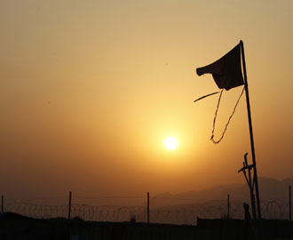 A torn Afghanistan national flag flutters during sunset in Combat Outpost Penich near the Afghanistan-Pakistan border in Kunar / (Reuters /Erik de Castro)