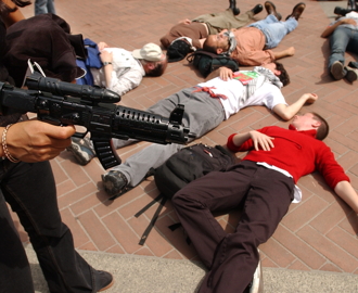 Students on the steps of UC Berkeley's Sproul Plaza reenact a 1948 Israeli attack on an Arab village. (Ben Margot/AP)