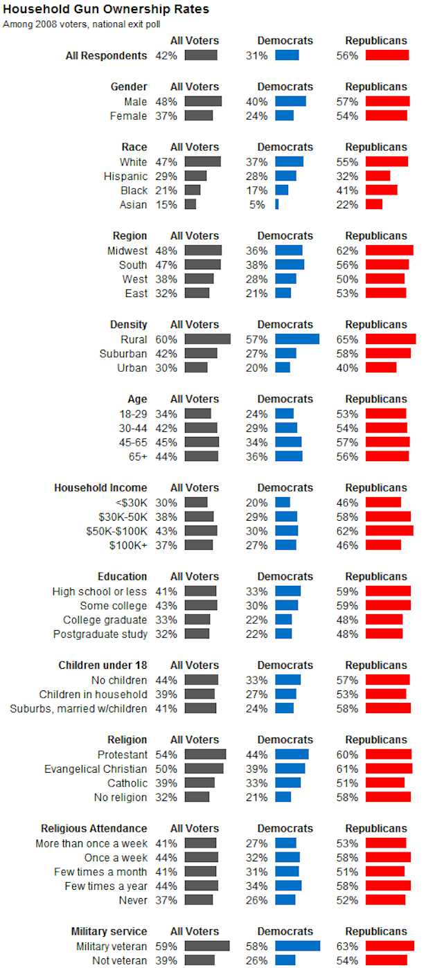 Nate Silver has brought his trademark data analysis to the newfound gun control discussion today, breaking down what gun ownership in this country looks like numerically. Using data from a 2008 national exit poll—the question was not included, he explains, on 2012 exit polls—some of the details in his chart will likely strike you as obvious: for instance, that Republicans own more guns than Democrats and that there are far more guns in rural areas. What might be more interesting, as Silver points out, is that gun ownership is not necessarily tied to being religiously devout, despite Presdident Obama's 2008 suggestion about communities that "cling to guns or religion." Also, the chart reveals that gun ownership is "highest among the middle class," as Silver writes, with people making $50,000 to $100,000 per year more likely to own guns than their counterparts in other wage groups. Check out the entire chart below, and read the rest of Silver's analysis here.