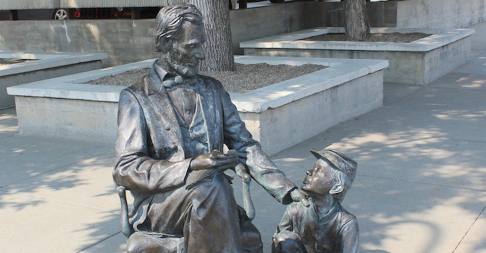 That theme is the amount, and the diversity, of the efforts people are putting into reviving their downtowns. As a citizen I've become used to this depressing iron law of small town life: The big-box malls move in, and the downtown dies out. But we've been hearing about places where downtowns have fought back. Rapid City has a significant tourist economy, for visitors to nearby Mount Rushmore, and over the past decade it has pushed a tourist-oriented downtown revival with its Rushmore-related identity as "City of Presidents." Thus there are life-sized statues of presidents #1 through #43 on corners through the downtown, many in surprising or whimsical poses. Some of them are hard to identify until you peer at the plaque. The one above is easy; the one below might be a test.