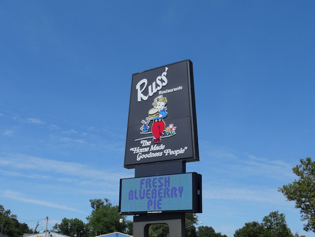 (Today's photo theme includes windmills in Holland, precisely because I've tried to establish by now that so much else is going on in what some visitors experience as a kitschy "Tulip Time" resort. This is the windmill outside Russ's Restaurant, whose main sign is shown lower down.)
