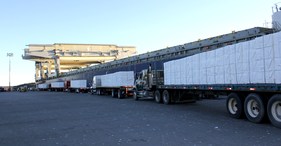 Greetings from the American city closest to Europe, and first to see each day's sunrise: Eastport, Maine, which Marketplace will describe in its broadcast on Friday and which we'll say more about starting tomorrow. The scene above is of an unimaginably vast warehouse full of bales of Maine hardwood pulp, destined for mills in Asia.
