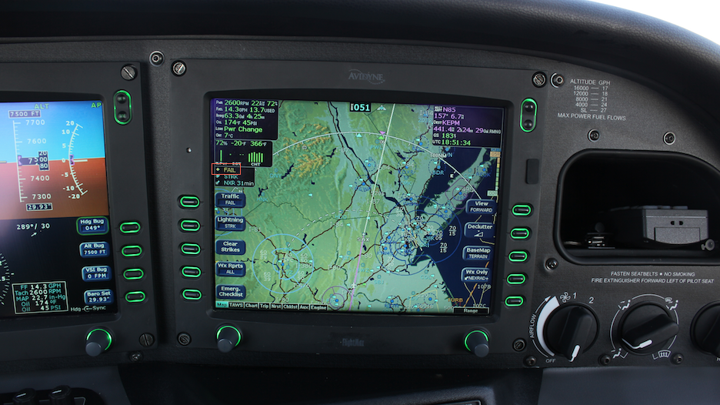 An hour into the flight, I began noticing one anomaly with a sophisticated part of the Cirrus's navigation-and-awareness equipment. If you are a Cirrus or Avidyne person and peered at the picture below, you might detect it. It was the tiny yellow "Fail" signal, which I've boxed in red. It indicated that the traffic sensor system -- letting you know about other planes in the vicinity -- had gone bad.