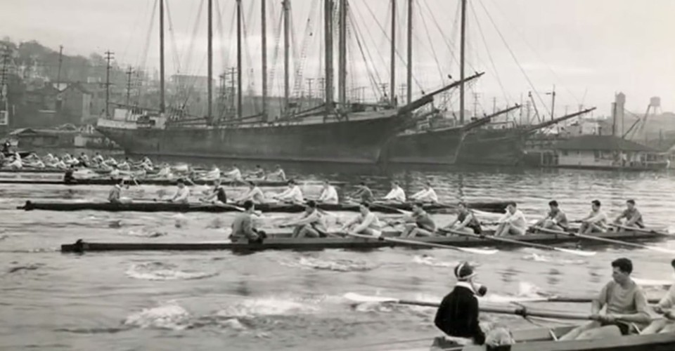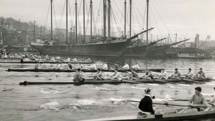 The shot above, from a promotional video for the book, shows (I am pretty sure) boats racing through the Montlake Cut in Seattle. "The Cut" is part of the canal between Lake Washington and the Puget Sound, and it is where the heroes of the tale, the nine-man University of Washington crew, were based. I assume this picture is of that boat, which means that it was taken nearly 80 years ago. The races on the Cut didn't look much different when we watched them while living in Seattle in the early 2000s.