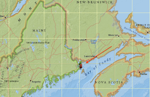 I am with Mr. Strip. If you start at any point in the United States and, contrary to the advice of Horace Greeley, keeping heading east, the coastal reaches of "Down East" Maine are where you'll end up. And the only possible contender to Eastport as the place at which you could make no further progress east would be the neighboring town of Lubec, which is microscopically closer to the watery boundary with Canada. Eastport is in green below, Lubec in red.