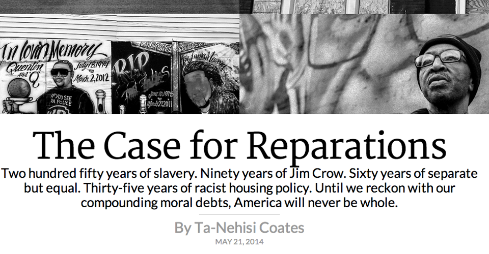 Then read Ta-Nehisi Coates's magnificent new article in the latest issue of the Atlantic. It is about America's failure to come to terms with a central, brutal reality of our long-ago past and our ongoing present. When he talks about "reparations," he is talking about a process that begins with facing the truth, and the past, with the honesty we fault the Japanese or Chinese for failing to display.
