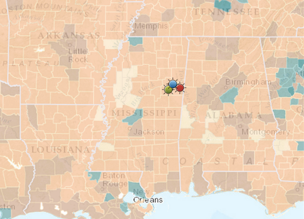 These maps, via the ArcGIS software from our partner Esri, are useful beyond their specific relevance for this state or the South. For one thing, they are zoomable. The more you click in, using the + button, the finer the resolution, until you end up seeing specific Census tracts and blocks. As you zoom back out, with the - button, you see averaged values for counties or states as a whole.
