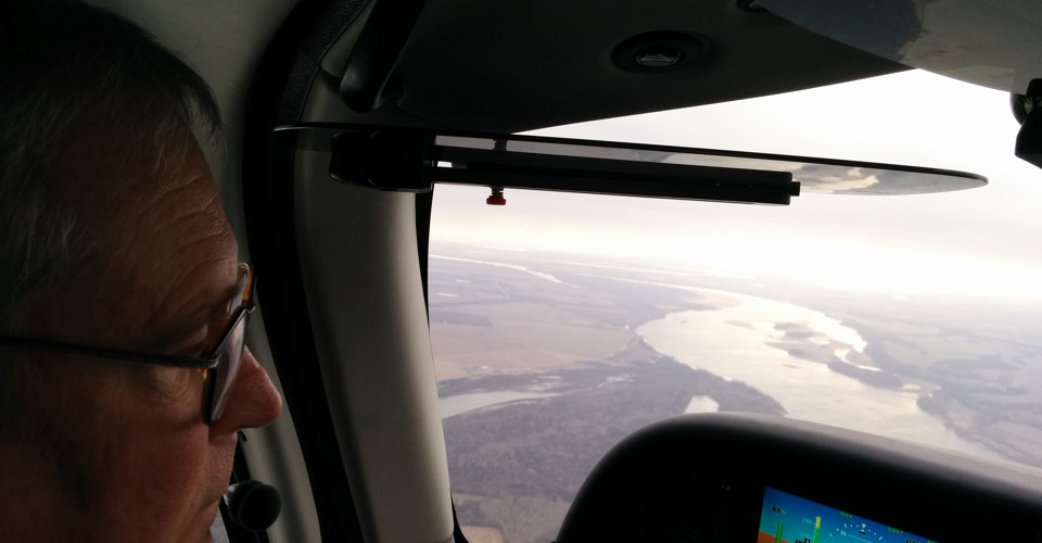 On to Little Rock. The plane felt sprightly with its new spark plug. The weather reports, which Jim spends all his time checking whenever we're on the ground, were good. Skies were clear, so we planned a "visual flight rules" route direct to Little Rock at 2,500 feet — high enough to be comfortably above the ground in the flatlands on either side of the Mississippi, low enough to be well clear of the clouds and have the close-up view I always prefer of the changing landscape.