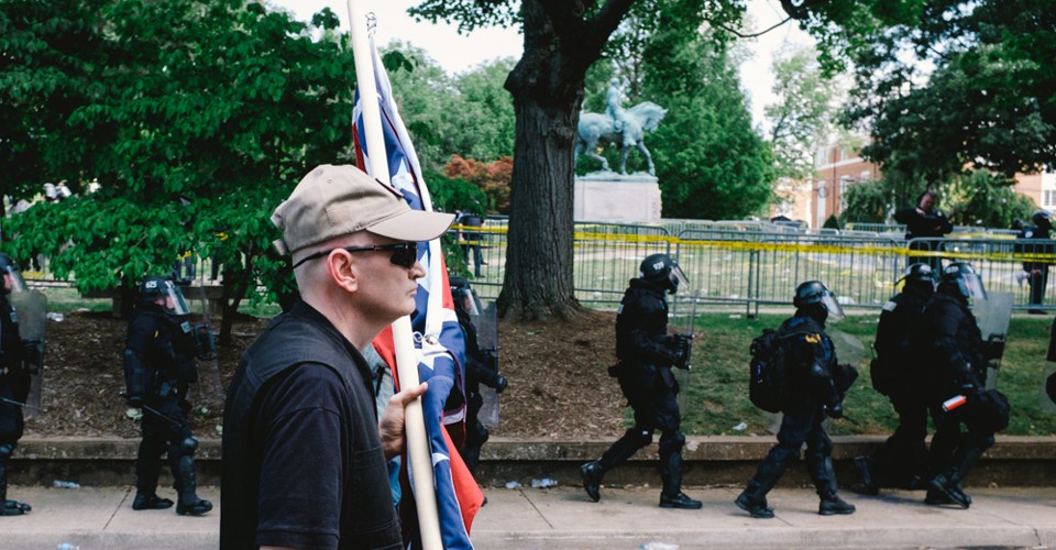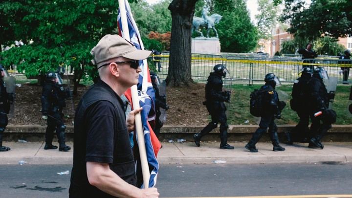 A white nationalist is seen leaving Emancipation Park in Charlottesville, Virginia, where violent clashes took place between counter-protesters and white-nationalist groups. Hundreds of white nationalist gathered at the park for a “Unite The Right” rally to protest the removal of the statue of Robert E. Lee, which is seen in the background.Seth Herald / The Atlantic