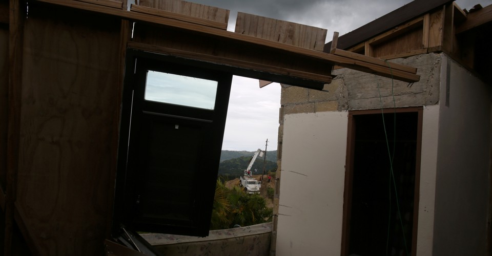 People work on an electricity poll in the background of a destroyed house in Utuado, Puerto Rico, on May 12.Alvin Baez / Reuters