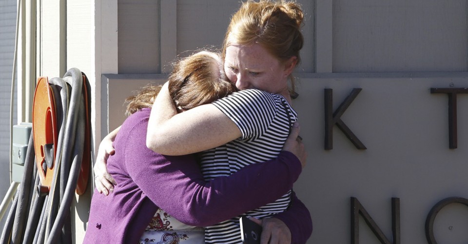 Umpqua Community College alumnus Donice Smith (L) is embraced after one of her former teachers was shot dead. (Steve Dipaola / Reuters)