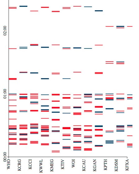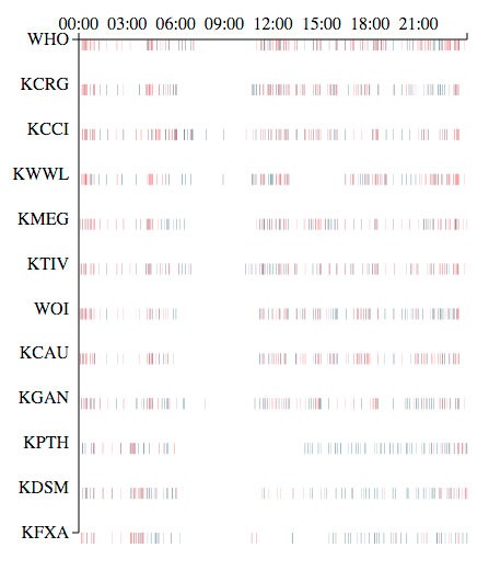 Channels are on the left, and time runs from midnight to 11:59 p.m. along the top. Each bar is a single political ad (blue being a Democratic ad, red being Republican):